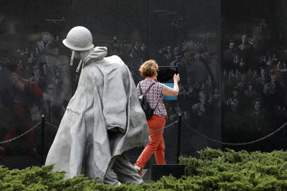 在美國華盛頓特區的韓戰老兵紀念碑(Korean War Veterans Memorial),一名遊客拿著iPad照相。