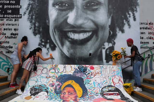 在聖保羅,人們拿著鮮花在已故里約市議員法蘭珂(Marielle Franco)的照片前哀悼。
