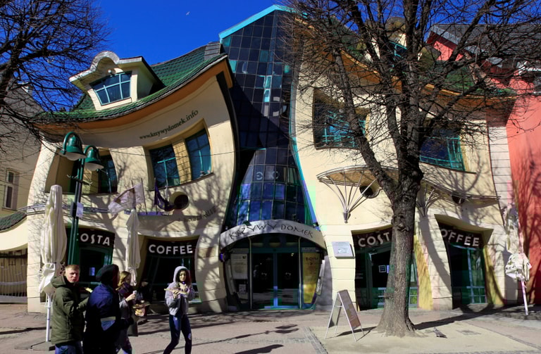 在波蘭北部的濱海小鎮索波特(Sopot),觀光客走過波蘭建築師札列斯基(Szotynscy Zaleski)受童話插畫家啟發而設計的歪歪屋(Crooked House)。
