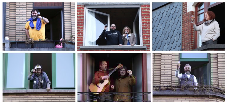 在首都布魯塞爾,為了防疫而待在家的民眾,來到窗台手拿著酒和大家乾杯。