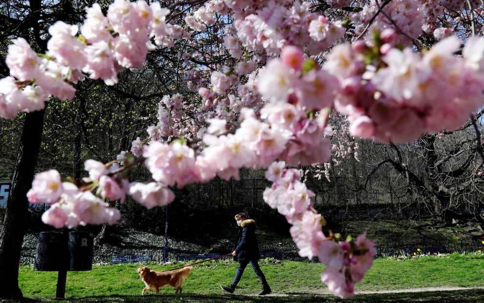 在首都布拉格的一座公園內,一名戴著口罩的民眾正在遛狗。