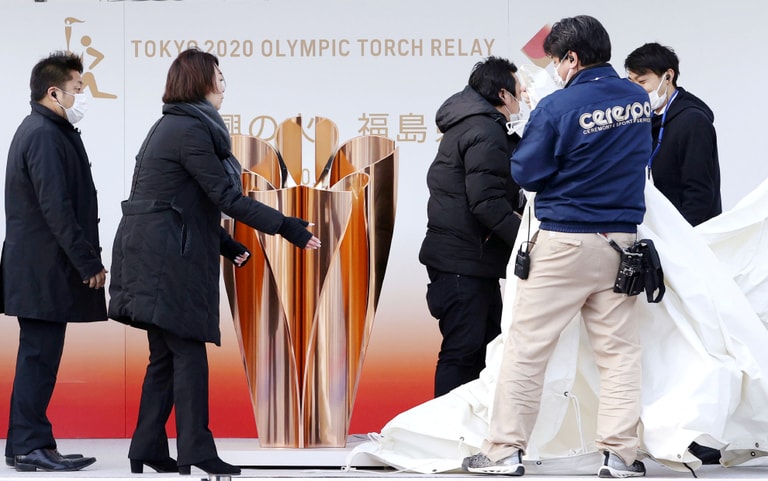 在準備迎接 2020東京奧運聖火的福島縣,工作人員將聖火座給移開。