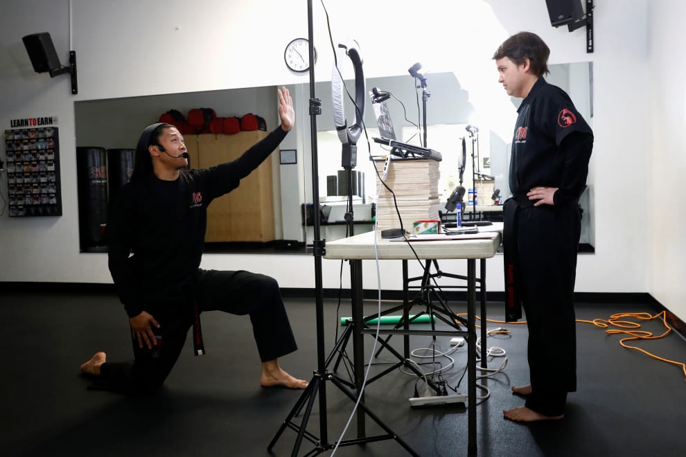 雖然加州因為疫情的關係遭封鎖,但熱愛武術的民眾依舊利用視訊的方式在家上課,武術老師也賣力地在鏡頭前教學,並且用「遠距擊掌」鼓勵學生。