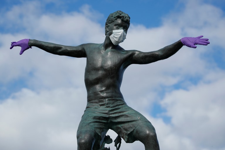 在加州恩西尼塔斯市(Encinitas),一尊衝浪者的雕像在防範COVID-19(武漢肺炎)疫情期間,被人戴上了口罩和手套。