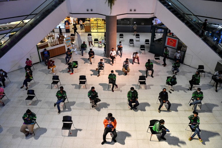 在曼谷一間商場內,外送人員彼此保持距離等待送餐。