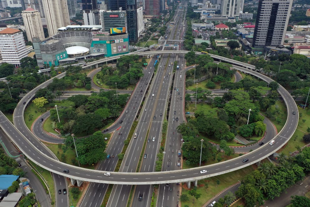 印尼雅加達西曼吉(Semanggi road)交流道的空拍圖,顯示在COVID-19(武漢肺炎)爆發後,車流量也大減。
