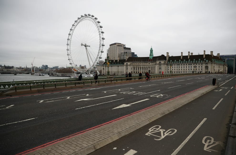 英國倫敦西敏寺橋。英國近期也因快速增加的COVID-19(武漢肺炎)確診案例,街道上的行人少了許多。