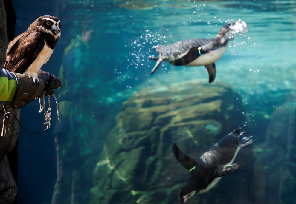 在防疫期間,華盛頓州西雅圖市的林地公園動物園(Woodland Park Zoo)沒有對外開放,預計三月將損失 190萬美元(折台幣約 5,785萬元)。與此同時,動物園的工作人員乾脆帶著園內的眼鏡鴞科巴(Coba)來看漢波德企鵝 (Humboldt penguin)游泳。