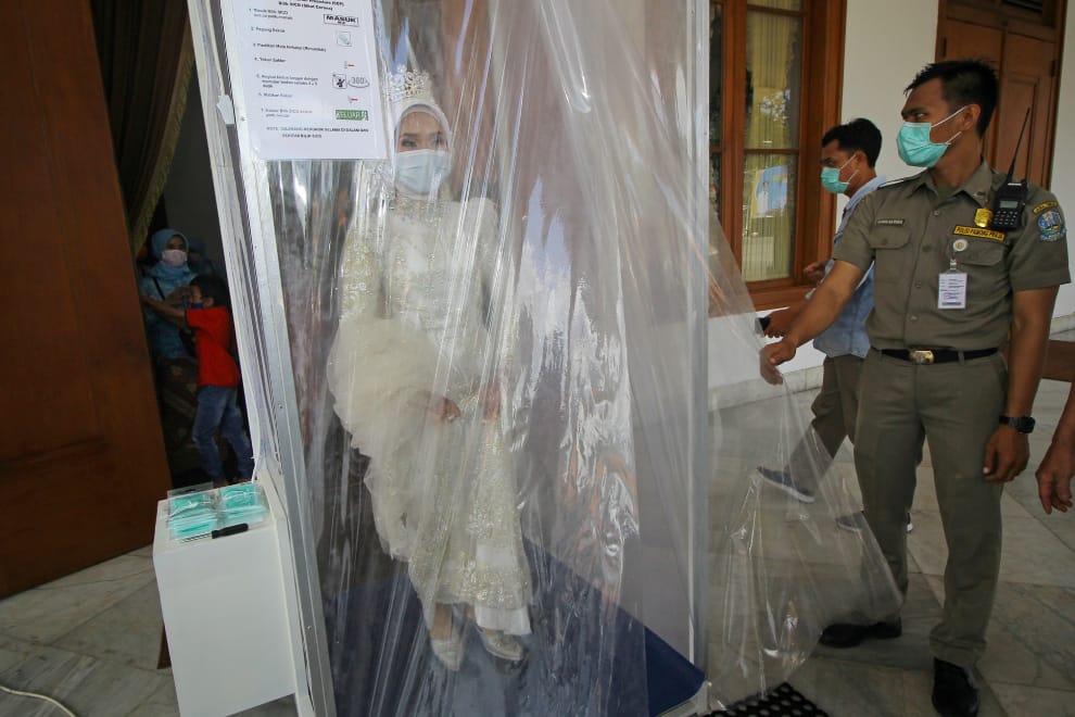 在印尼第二大城泗水,一名新娘在婚禮當天先進到消毒室中進行全身消毒。