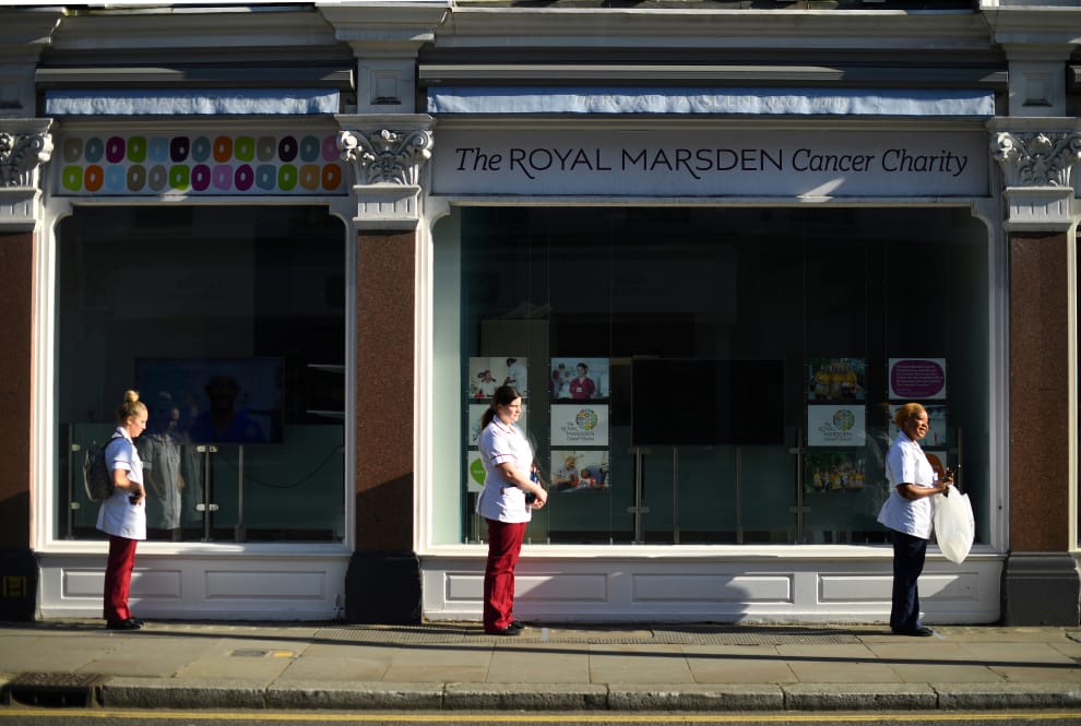 在倫敦街頭,護理師們在排隊領取外界捐贈的愛心午餐時,彼此保持兩公尺的距離,以遵守當局的防疫建議。