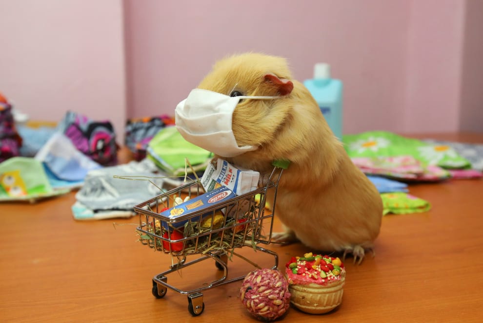 在烏克蘭東北部的卡爾可夫市(Kharkiv),專門製作口罩送給老人家和低收入戶的團體為他們的天竺鼠做了新打扮,讓天竺鼠示範只要外出購物就一定要戴口罩,避免遭到COVID-19(武漢肺炎)感染。