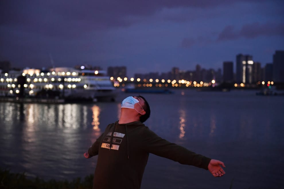 在湖北省武漢市,一名男子戴著口罩沿著長江美景做運動。