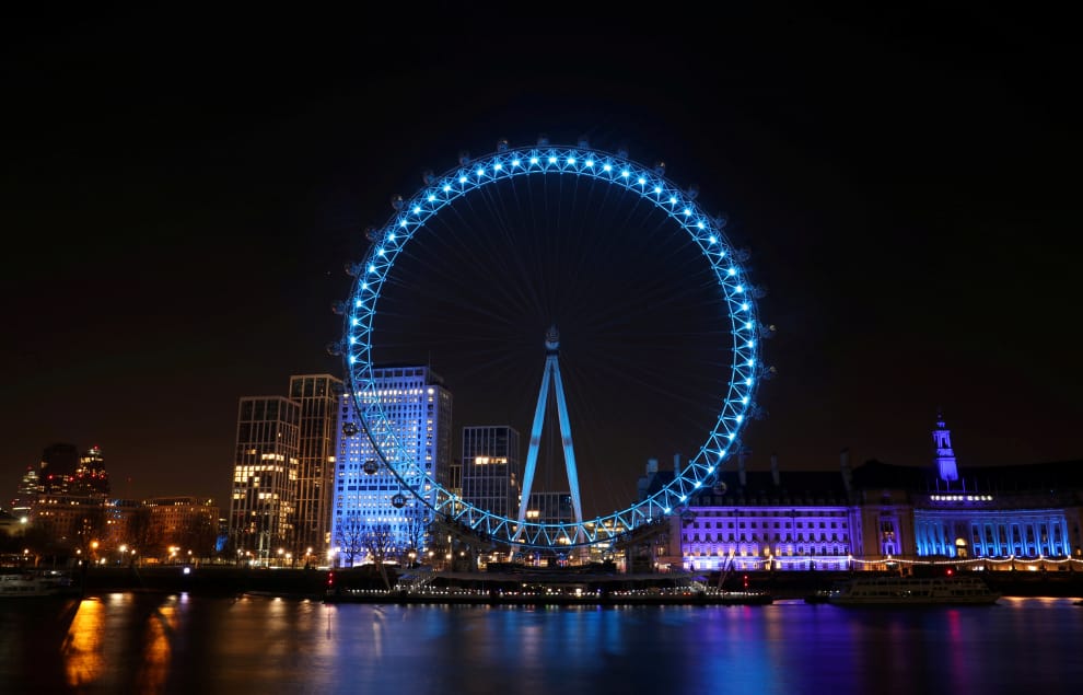 位於泰晤士河畔的倫敦眼摩天輪點起了代表英國國民保健署(NHS)的藍色燈光,以此來支持和感謝在第一線對抗疫情的醫護人員。