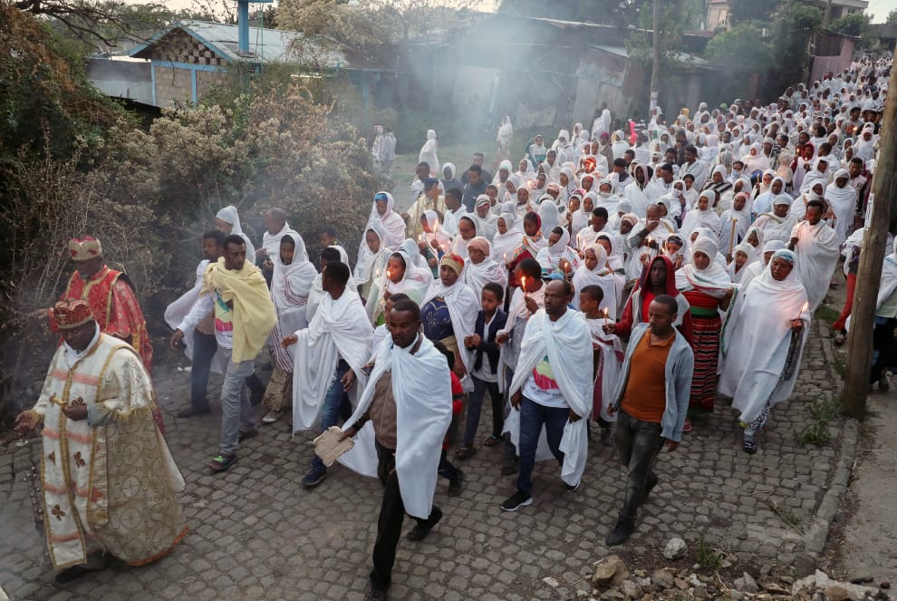 在首都阿迪斯阿貝巴(Addis Ababa),東正教教會的牧師和信徒燃起了蠟燭,一邊遊行一邊祝禱,希望COVID-19(武漢肺炎)疫情能盡快落幕。