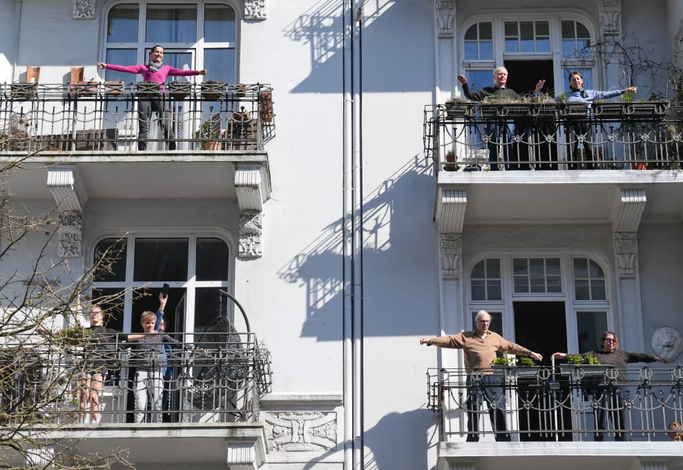 在漢堡市,人們來到陽台上跟著健身教練塞萬提斯(Patricio Cervantes)一起活動筋骨,避免因為疫情待在家而讓身體失了元氣。