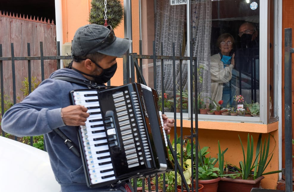 在智利中部的康塞普西翁(Concepcion),阿庫納(Gonzalo Acuna)隔著玻璃演奏手風琴給他的爸媽聽,他的爸媽正在練習居家檢疫。