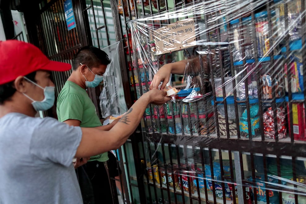 在菲律賓人口最多的奎松市(Quezon City),人們戴著口罩到只留一個交易小洞的商店買東西。
