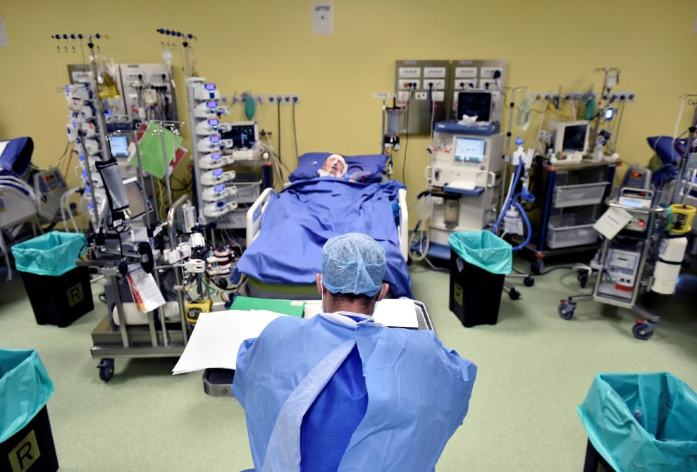 在米蘭的聖拉斐爾醫院(San Raffaele hospital)內,身穿防護衣的醫護人員正在加護病房內照顧罹患COVID-19(武漢肺炎)的患者。