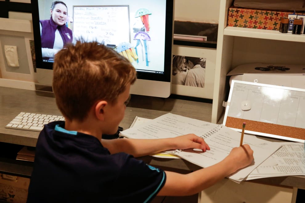 在華盛頓州的西雅圖市,今年七歲的麥克萊納漢(Oakes McClenahan)跟著電腦螢幕另一頭老師的指示寫作業,響應華盛頓州州長英斯利(Jay Robert Inslee)的「待在家保健康」政策。