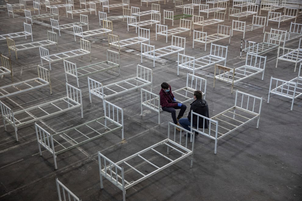 在塞爾維亞第二大城諾維薩德(Novi Sad),志工們坐在床架上稍作休息,這裡將出現一張張病床,專門照顧COVID-19(武漢肺炎)輕症患者。