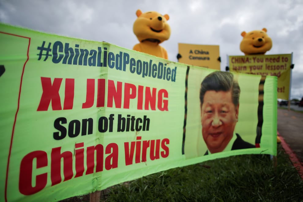 在首都巴西利亞的大街上,抗議民眾打扮成小熊維尼的樣子,拉起寫有中國領導人習近平和中國病毒字樣的布條,譴責中國隱瞞COVID-19(武漢肺炎)疫情,導致全球受災。
