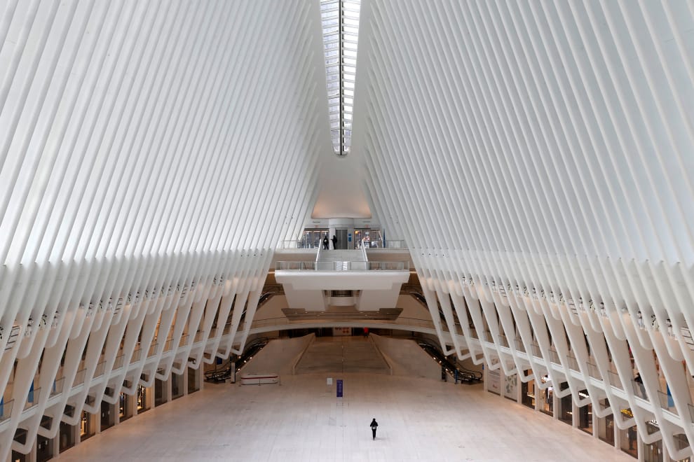 在紐約世界貿易中心車站,一名男子在空蕩蕩的大廳行走。