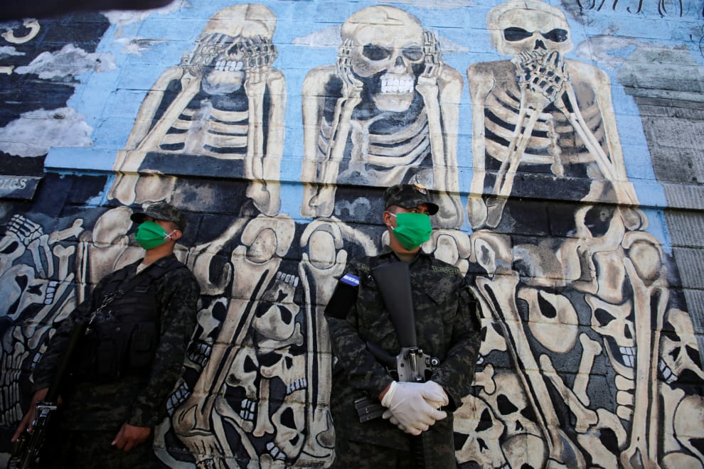 在首都德古西加巴(Tegucigalpa)的塔瑪拉(Tamara)監獄,戴著口罩的宏都拉斯軍人一邊發放口罩跟消毒液給受刑人,一邊維持秩序。