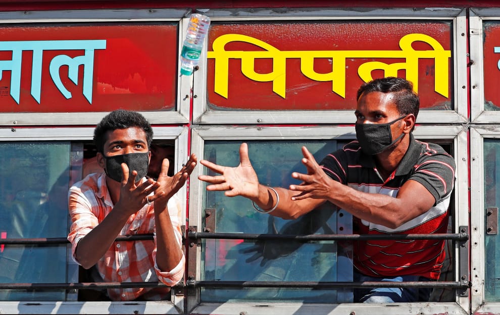 在位於北方邦的加濟阿巴德市(Ghaziabad),因應全國封鎖令、準備搭車回鄉的移工伸出手來接水。