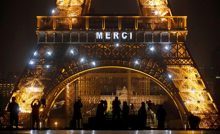 為了感謝在第一線防疫的醫護人員,巴黎艾菲爾鐵塔在夜間打上了「謝謝」字樣。