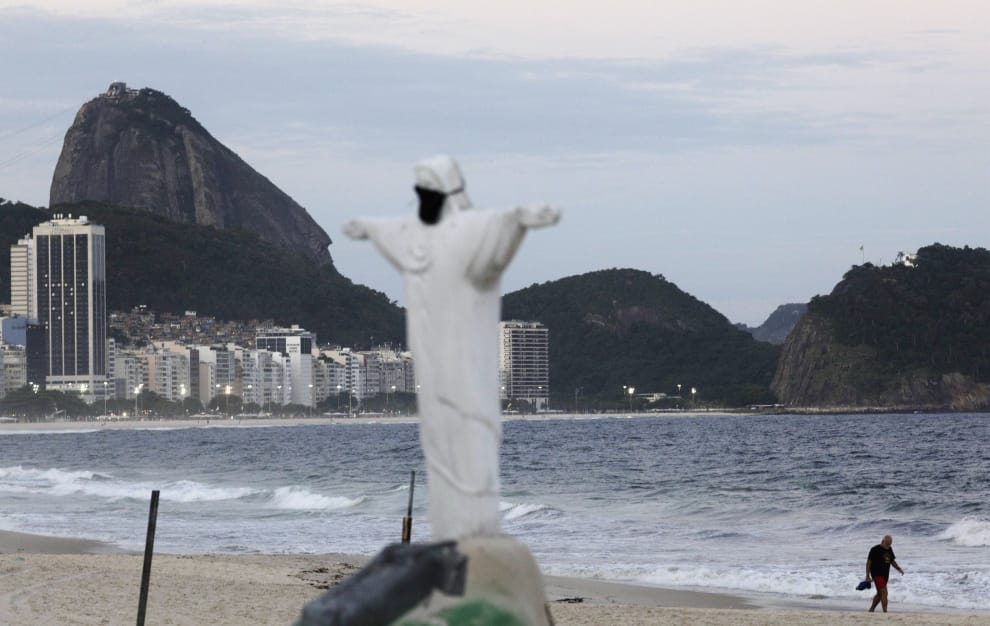 在里約熱內盧(Rio de Janeiro)的科帕卡巴納海灘(Copacabana beach)上,一名男子經過沙灘上一座戴著口罩的基督聖像(Christ The Redeemer)沙雕。