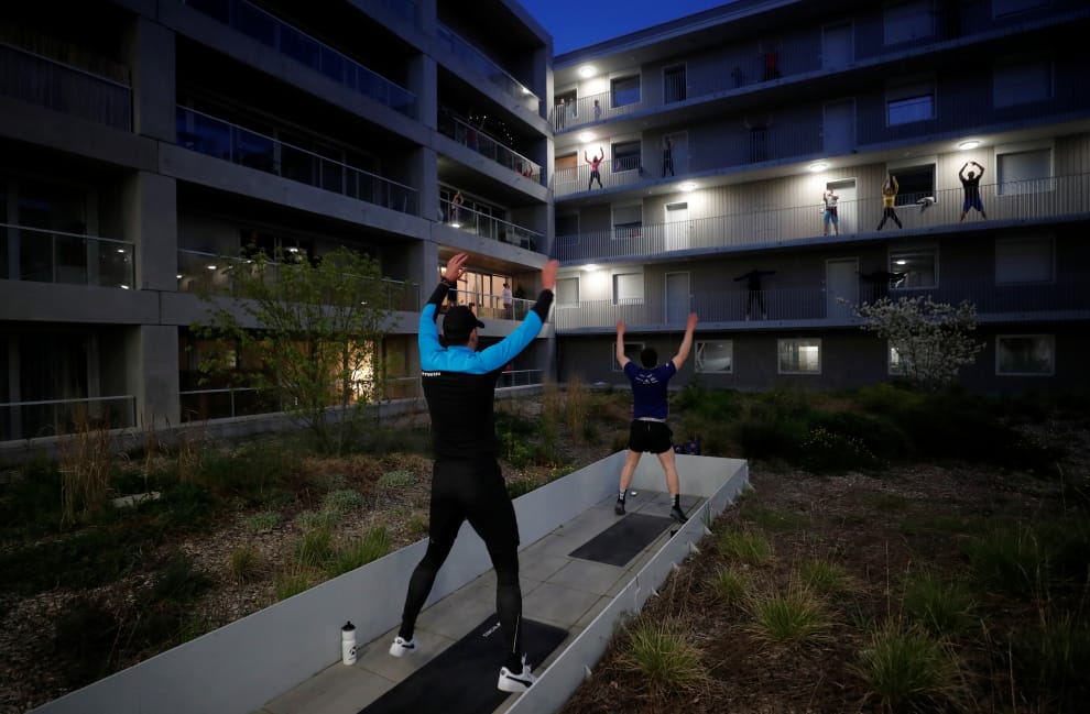南特(Nantes)一處社區的居民在陽台上,跟著訓練師一起運動拉筋,舒展身體。