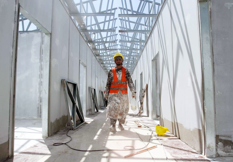 在赫拉特省(Herat)境內,一名建築工人走在工地中,這裡即將興建一棟最高能容納 100張病床的醫院,好用來收治赫拉特省境內的COVID-19(武漢肺炎)患者。