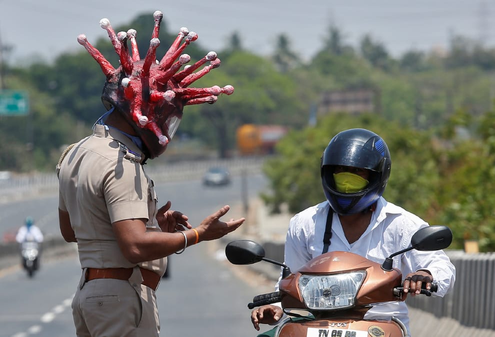 清奈(Chennai)省一條公路上,警察巴布(Rajesh Babu)戴著一頂 2019-nCoV病毒造型的安全帽,攔下一名機車騎士,要求他遵守印度 21天的封鎖令,盡速回家。