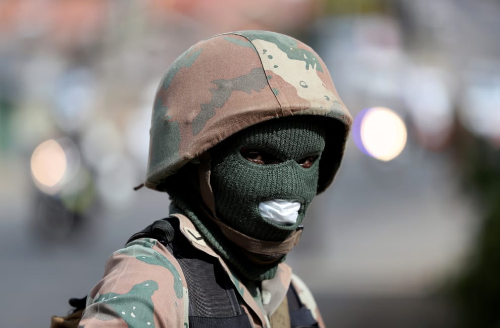 亞歷山德拉(Alexandra)鎮上,南非國防軍(South African National Defence Force)的隊員戴上面罩及口罩,在街上巡邏執行南非政府下達的 21天全國封鎖令。