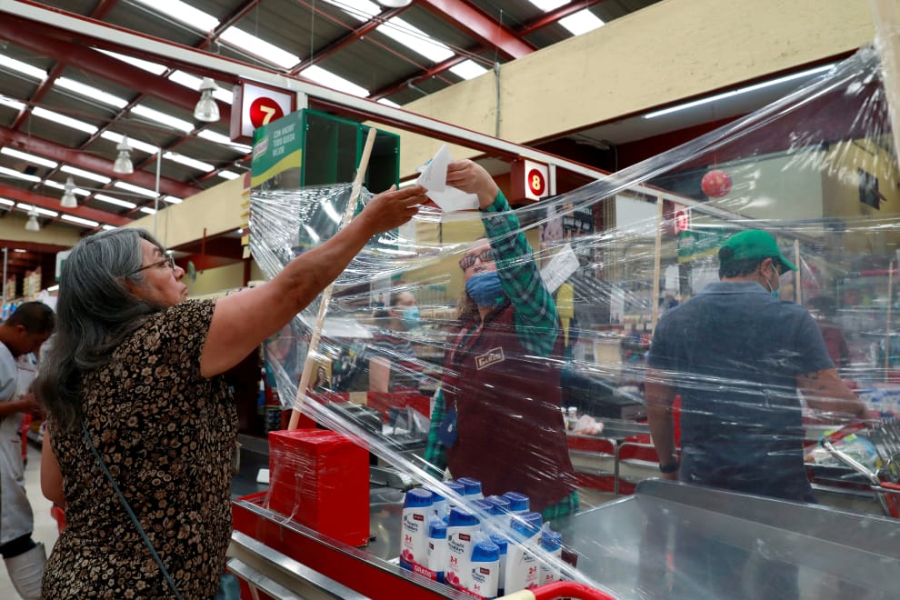 墨西哥中部的托盧卡(Toluca)市,一家嘉里斯超市(Garis supermarket)的收銀員,站在一層塑膠膜後面服務顧客,避免直接接觸而被感染。