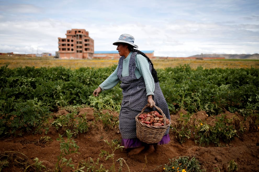 在玻利維亞拉帕斯省(La Paz)的拉賈村(La ja),一名農夫提著一籃馬鈴薯走在田野中。