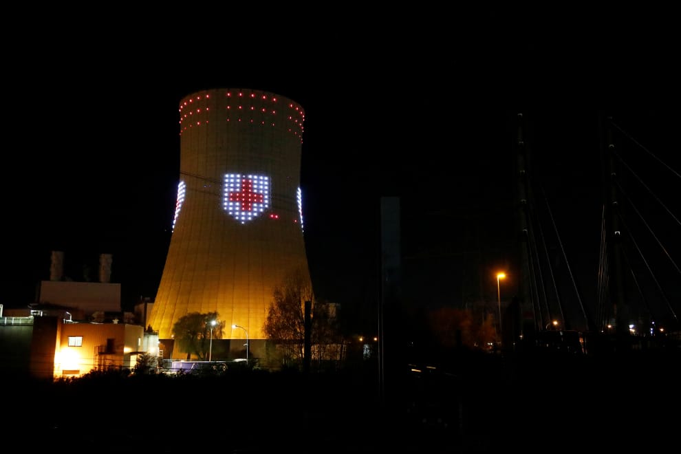 在布魯塞爾(Brussels)一座核能發電廠的冷卻塔上,被投影上象徵醫護人員的紅十字標誌,表達對他們的支持。
