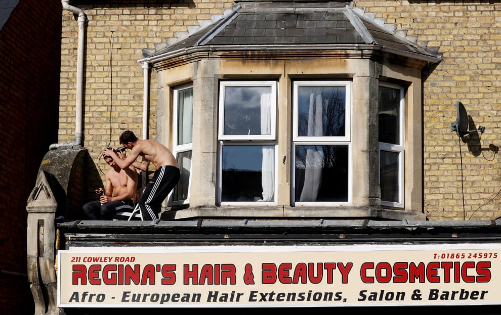 在牛津(Oxford)一間因政府下達的COVID-19(武漢肺炎)封鎖命令而暫時歇業的髮廊屋頂上,一位年輕人正替他的朋友理髮。