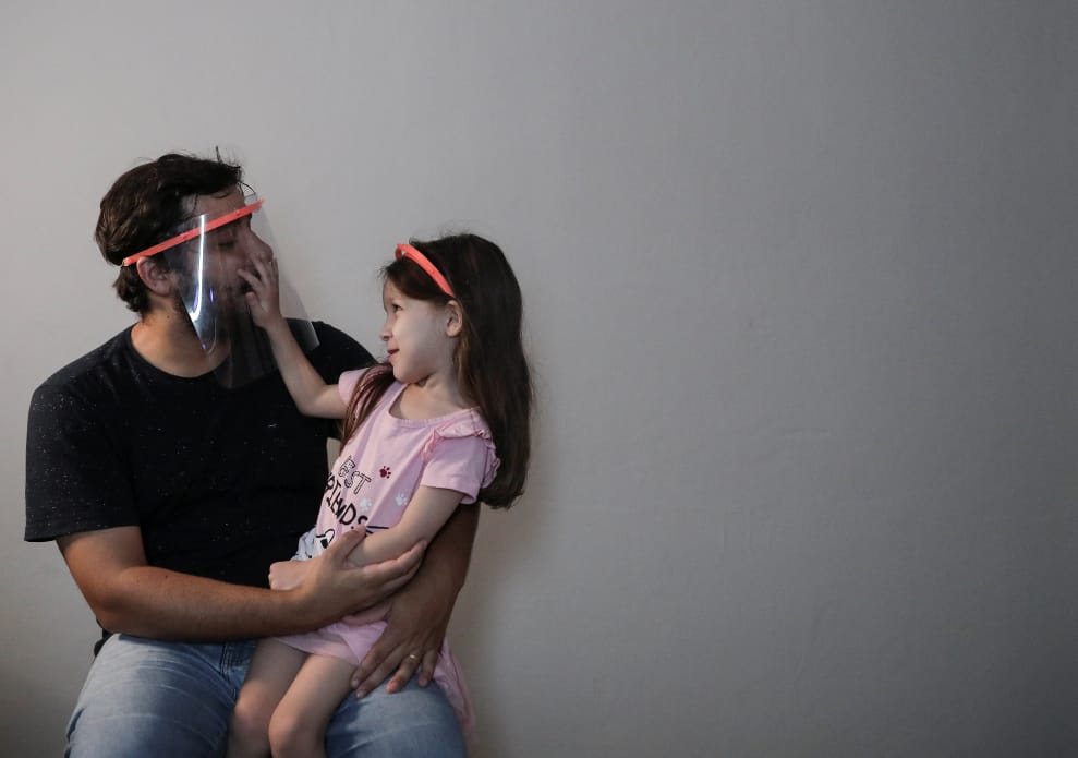 在巴西聖保羅州(Sao Paulo)工業城聖若澤-杜斯坎普斯(São José dos Campos),參與面罩自製計畫(Higia Project for Homemade production of face shields)的機械工程師達席爾瓦(Gabriel Santos da Silva),在完成一個 3D列印的面罩後,抱著女兒巴提娜(Betina Vieira da Silva)開心地和她聊天。