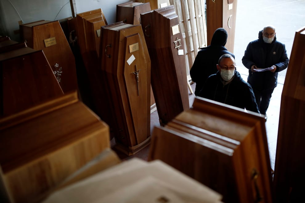 在法國巴黎近郊的里奧朗吉鎮(Rio-Orangis),殯儀館員工正在準備隨後將提供給COVID-19(武漢肺炎)死者的棺木。