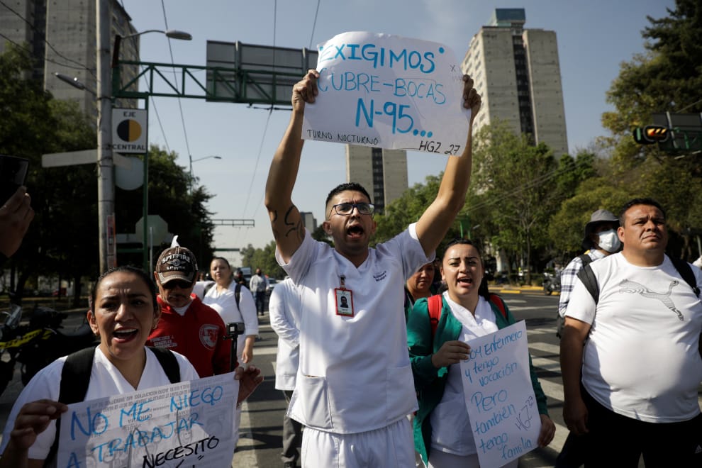 在首都墨西哥市(Mexico City),墨西哥社會保險機構(Mexican Institute of Social Security,IMSS)的醫護人員上街抗議,要求政府提供更好的防護裝備以供他們照護COVID-19(武漢肺炎)患者時使用。