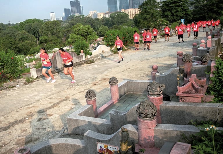 有趣的是,當地青年及文教團體每年都會號召千人聚集吉隆坡廣東義山,舉辦意義深遠的馬拉松跑步賽事,綿綿不絕的生命力也讓原本沉睡的義山復甦。每一年參與義山馬拉松的健兒們,沐浴在城市所剩無幾的綠肺,流下的汗水似乎在告訴安葬於此的先人,他們已經接下守護義山的火炬。