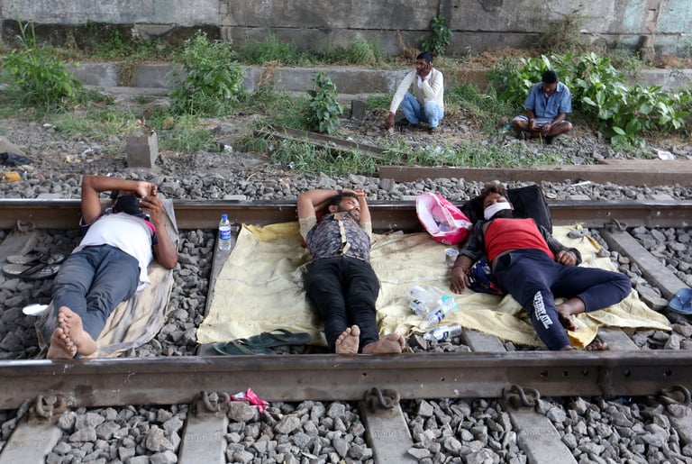 在印度商業大城孟買(Mumbai),三位移工躺在鐵軌上稍稍休息。