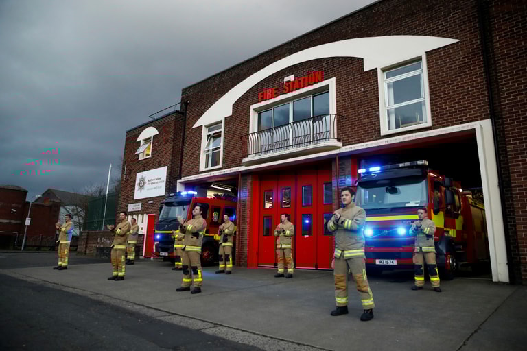 在英國貝爾法斯特(Belfast),卡多根消防站(Cadogan Fire Station)的消防員們在消防站外列隊鼓掌,響應「為醫護人員鼓掌(Clap for our Carers)」活動,表達對英國國民保健署(National Health Service)及醫護人員們的感謝。