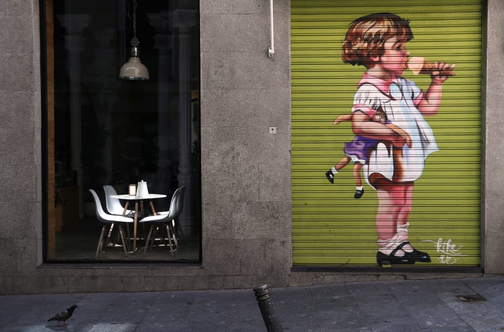 在首都馬德里(Madrid),一間鐵門上繪有小女孩享受冰淇淋塗鴉的冰淇淋店,現在也因西班牙政府的封鎖令被迫暫時歇業。