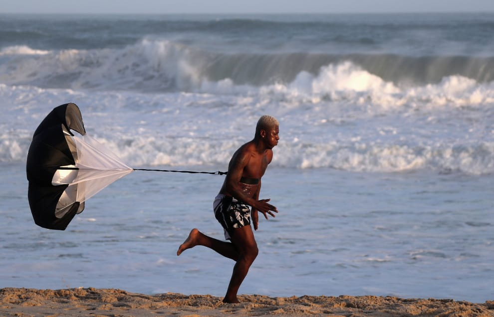 在巴西里約熱內盧的賀客里歐海灘(Recreio dos Bandeirantes,簡稱Recreio)上,一位民眾正沿著海灘奔跑。