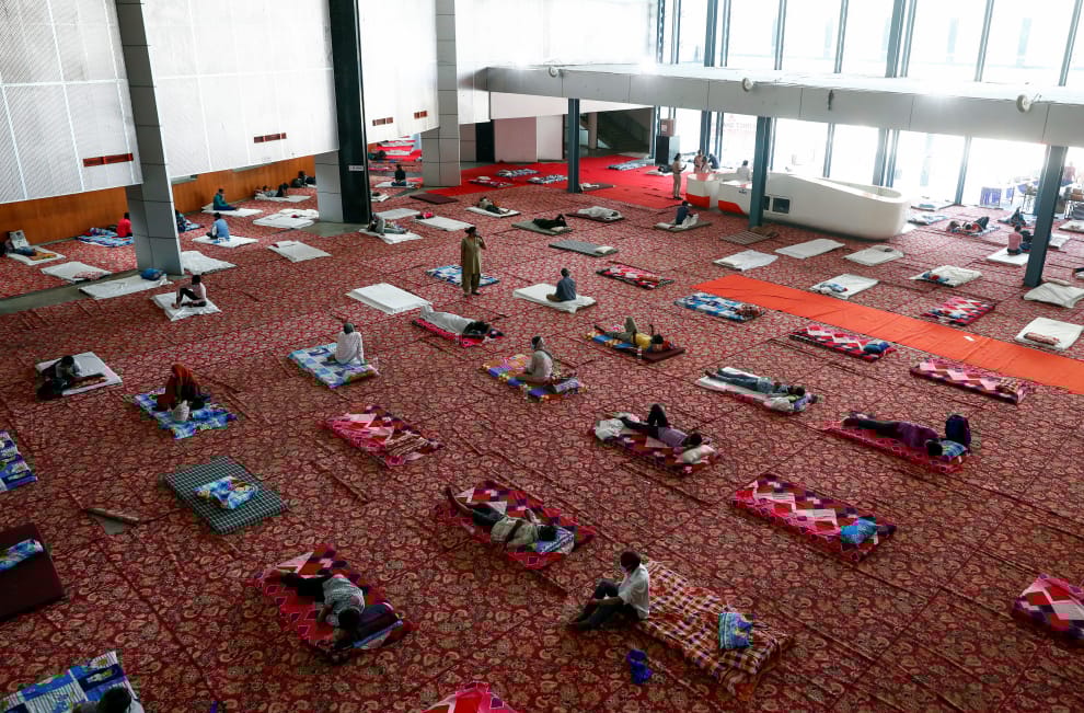 在首都新德里(New Delhi),全國封鎖期間,移工及遊民們聚集在一處綜合體育館改建成的臨時庇護所中休息。