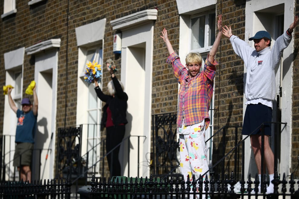 在英國倫敦的肯寧頓區(Kennington),居民們紛紛站在自家的台階上參加迦納爾(Simon Garner)舉辦的「台階上」(On the Step)運動課程。