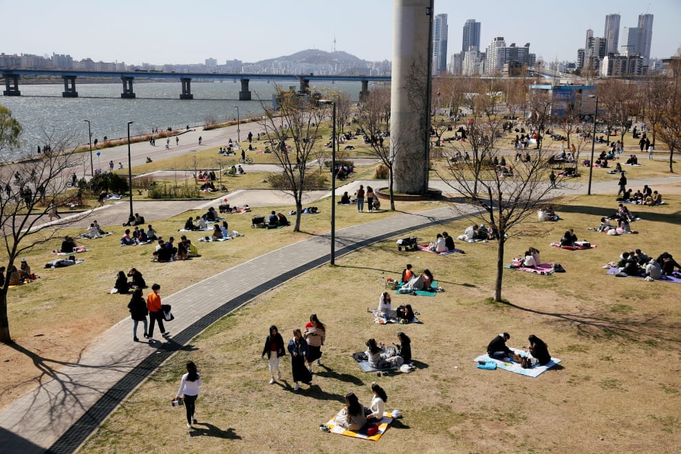 在首爾的漢江公園(Han River Park),民眾們紛紛出外到公園中野餐。