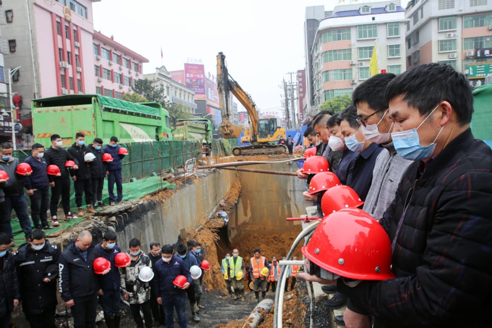 在湖南省邵陽市的一處工地,工人們配合政府命令脫下帽子,默哀弔念罹患COVID-19(武漢肺炎)離世的死者。